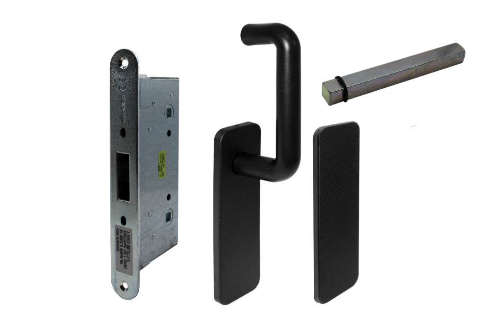 Kit crémone pompier pour vantail semi-fixe comprenant une contre-serrure, un demi-carré anti-panique, une demi-béquille et une plaque aveugle en finition acier inox.