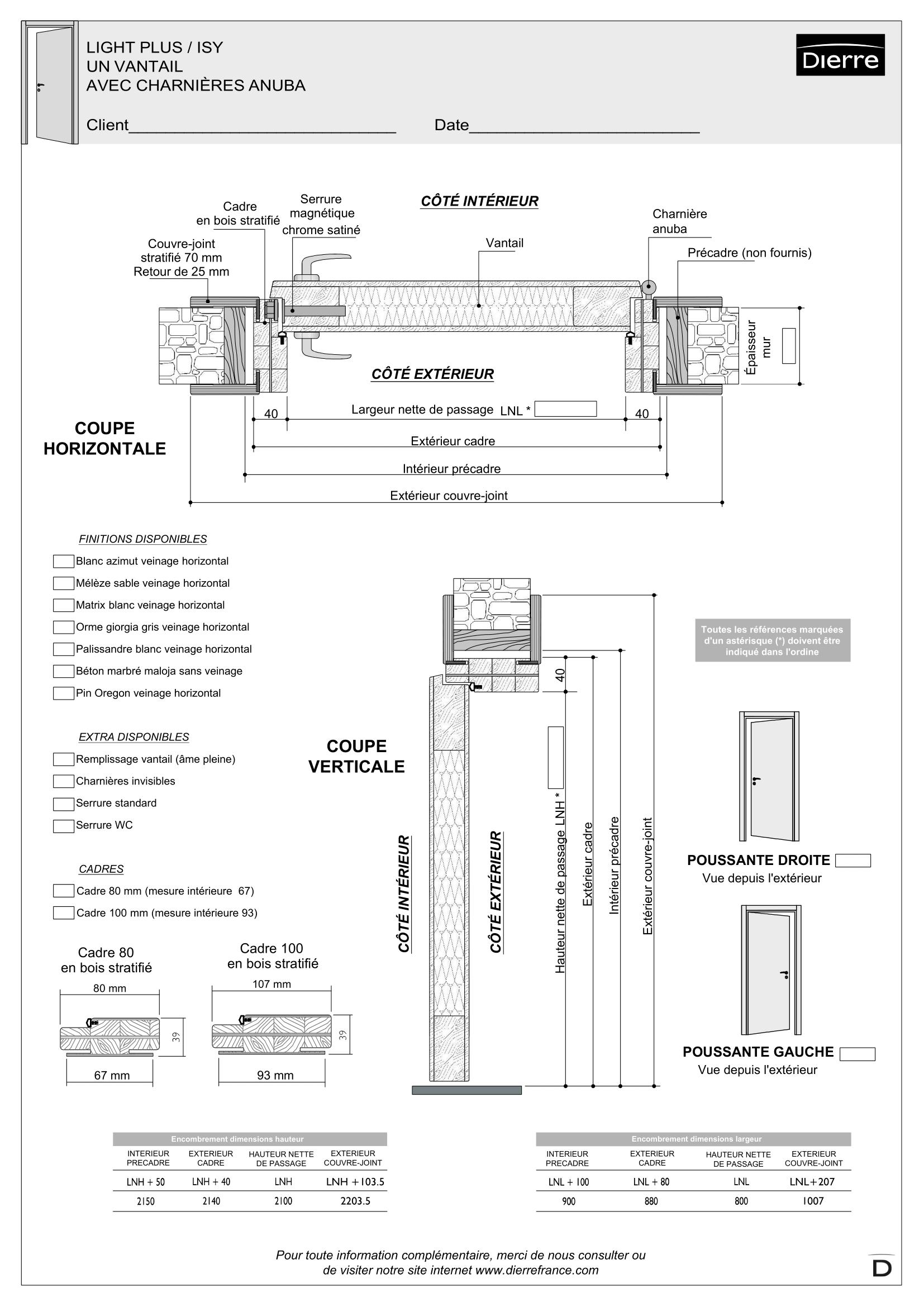 Disponible avec un large choix de finition, elle est fournie avec un cadre et des couvre-joints réglables en bois assemblé en version battante mais peut aussi être utilisée comme porte coulissante pour venir équiper nos châssis pour portes à galandage.