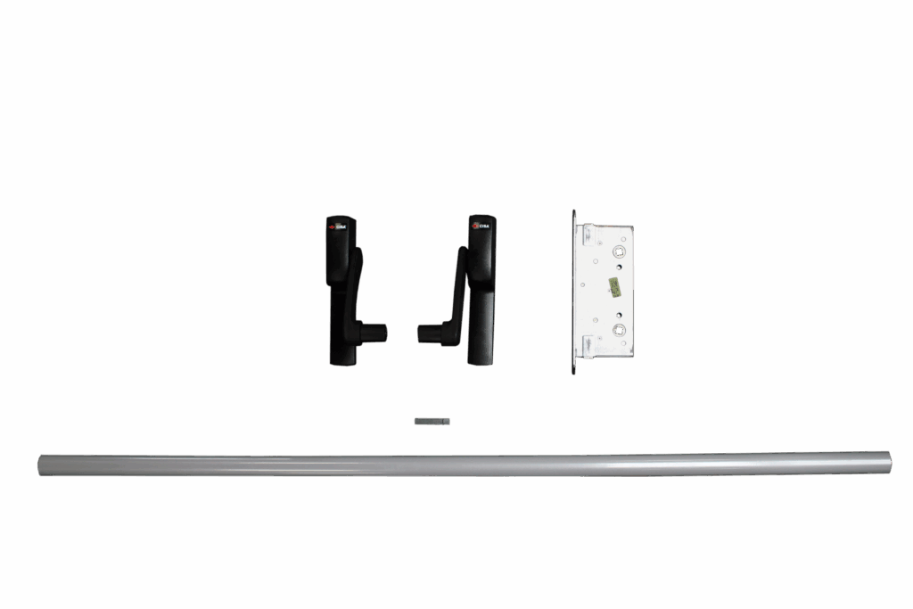 Kit anti-panique à barre avec bouton fixe extérieur noir, son demi-cylindre européen extérieur et sa serrure anti-panique.