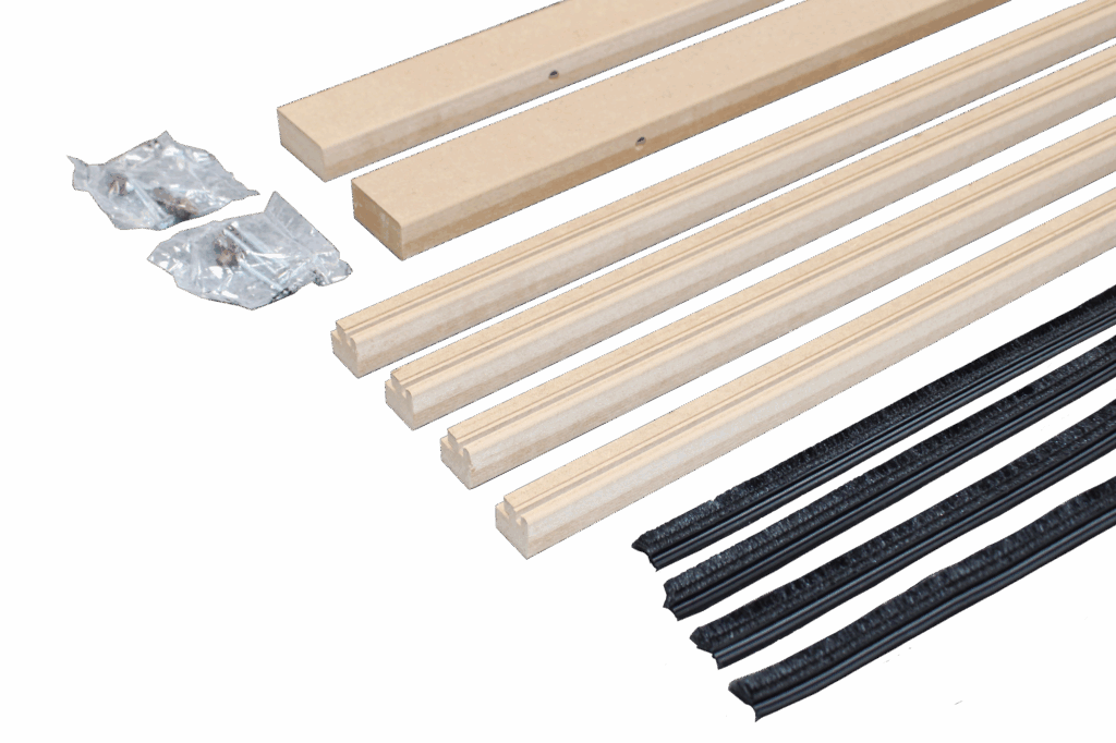 Kit de finition STYLE en tanganika brut à peindre pour châssis 1 vantail H.2100 x L.900 à couper à dimension sur le chantier.